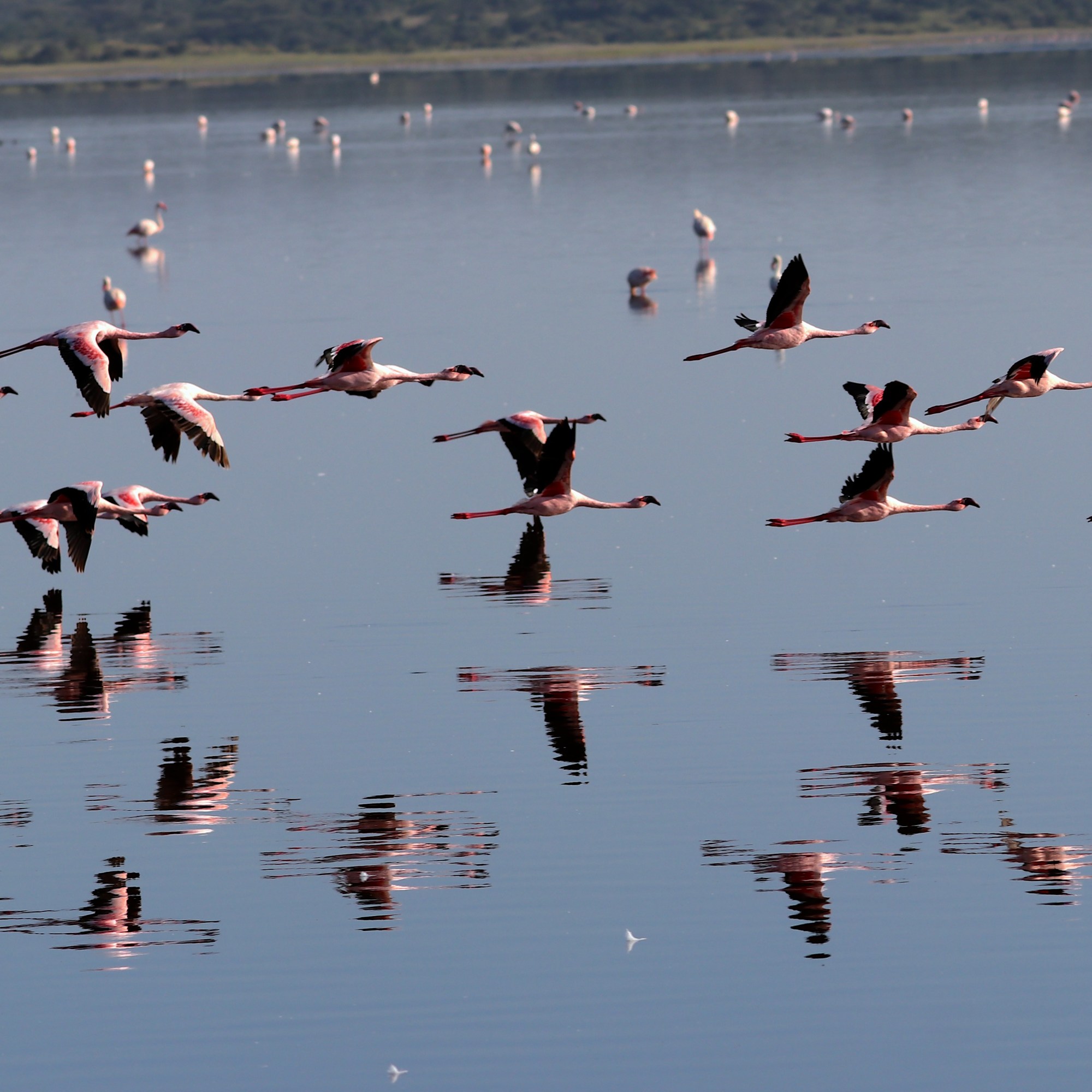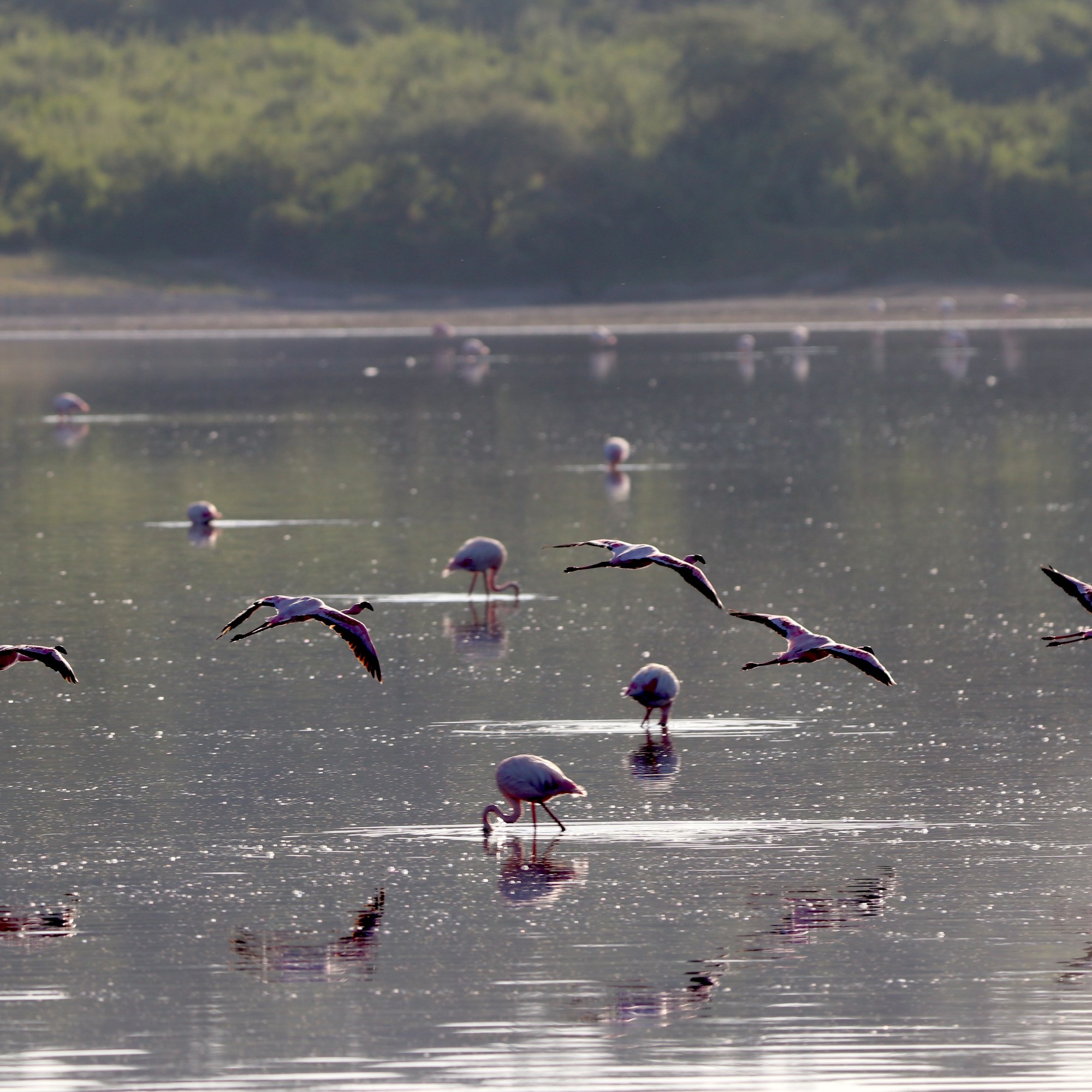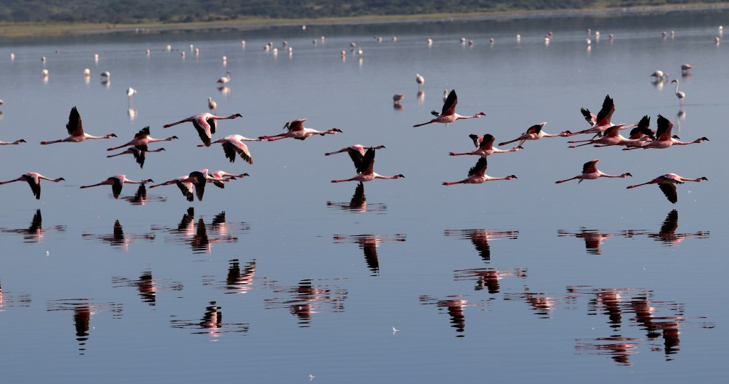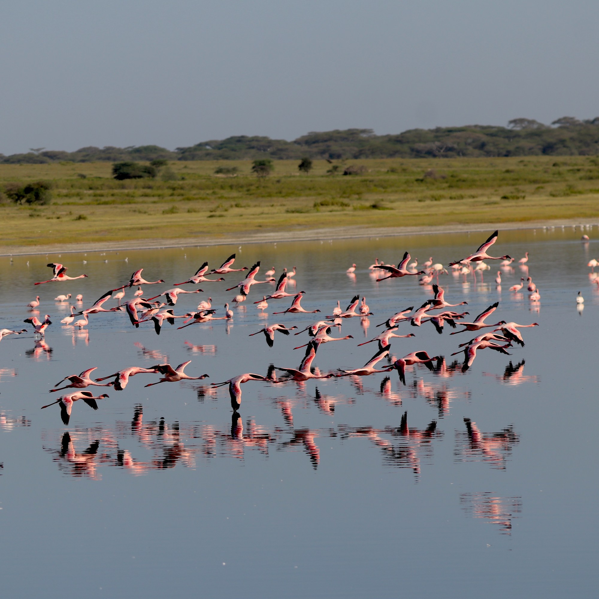 We head towards the Lake Ndutu and were immediately mesmerized by the sight of the lake filled with ‘Greater’ and ‘Lesser’ flamingoes. With the reflection of the morning sun and the pink plumage the lake seemed to turn pink at places. Suddenly a large flock of the flamingoes took to skies giving us an amazing spectacle.