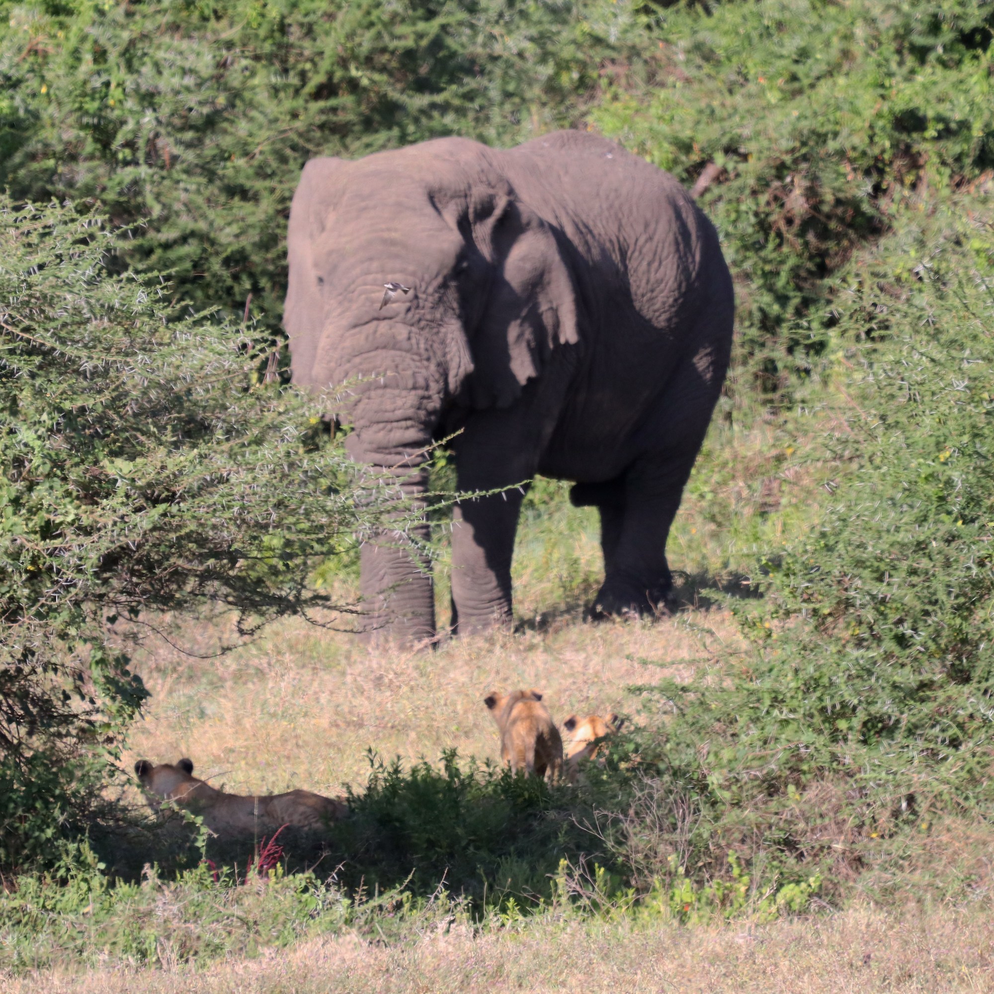 Our first sighting itself was of a lion family in the bushes. Suddenly an elephant grazing nearby behind the trees strolled in just ten feet from the lions. The parents went on alert and the lion cubs scampered out of the bushes giving us a near clear view of them. Each animal respected their territories and and life went on.