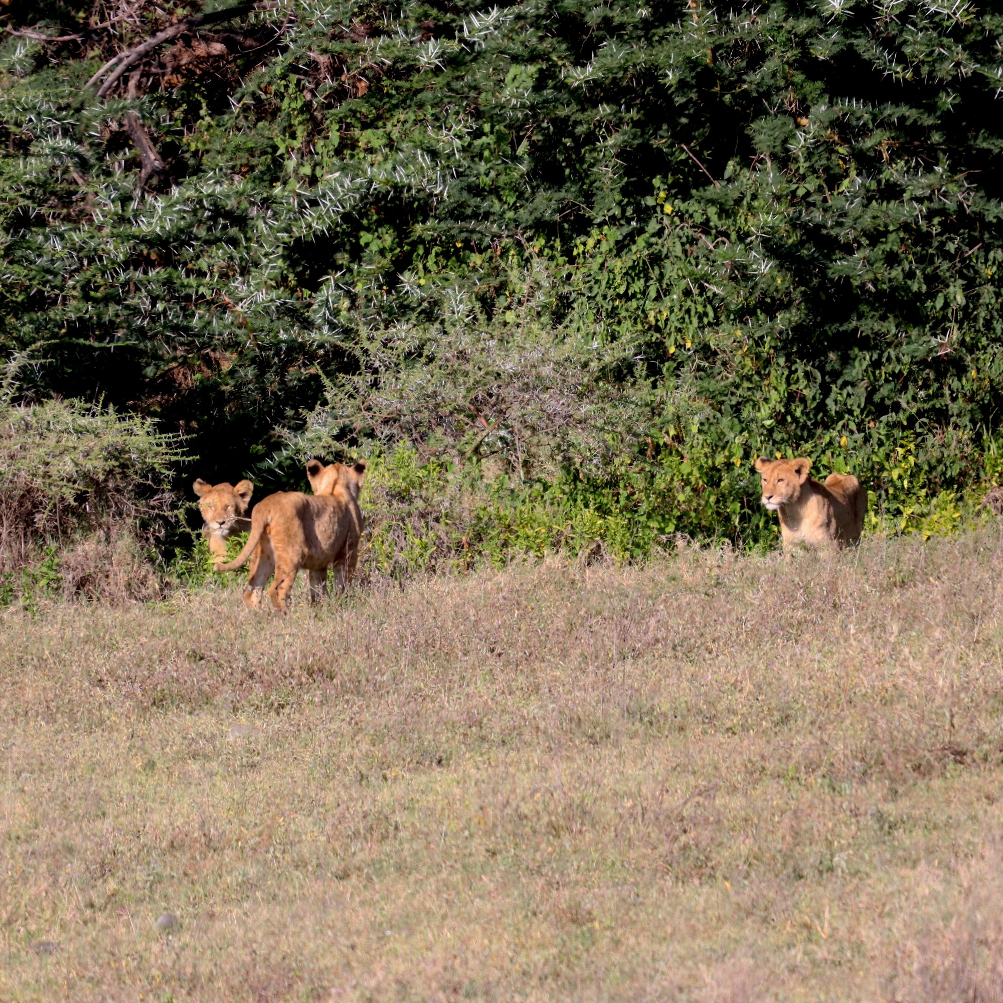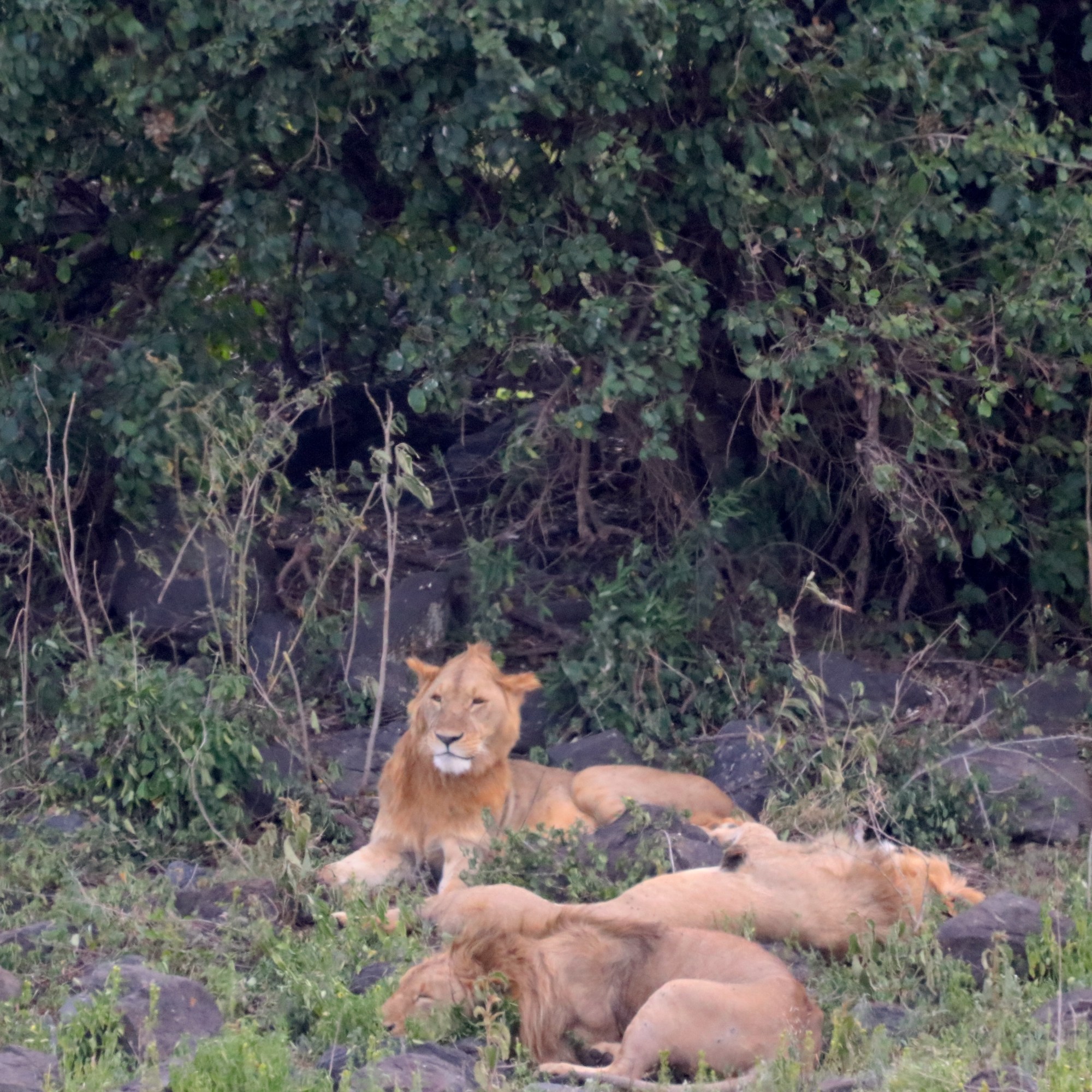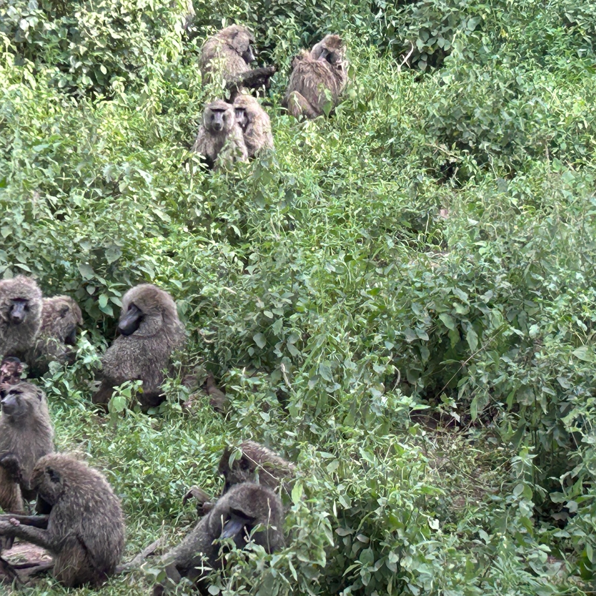 But the adventure was not over yet. As we prepared to leave the crater, we took a different route through the lush forested exit, and nature had more surprises in store for us. Beneath the shade of towering trees, three male lions lay resting, their golden manes blending seamlessly with the dappled light. Nearby, elephants moved with quiet grandeur, their sheer presence commanding respect. Along the winding path, a troop of baboons scavenged for food, their playful antics adding a touch of liveliness to the tranquil setting.