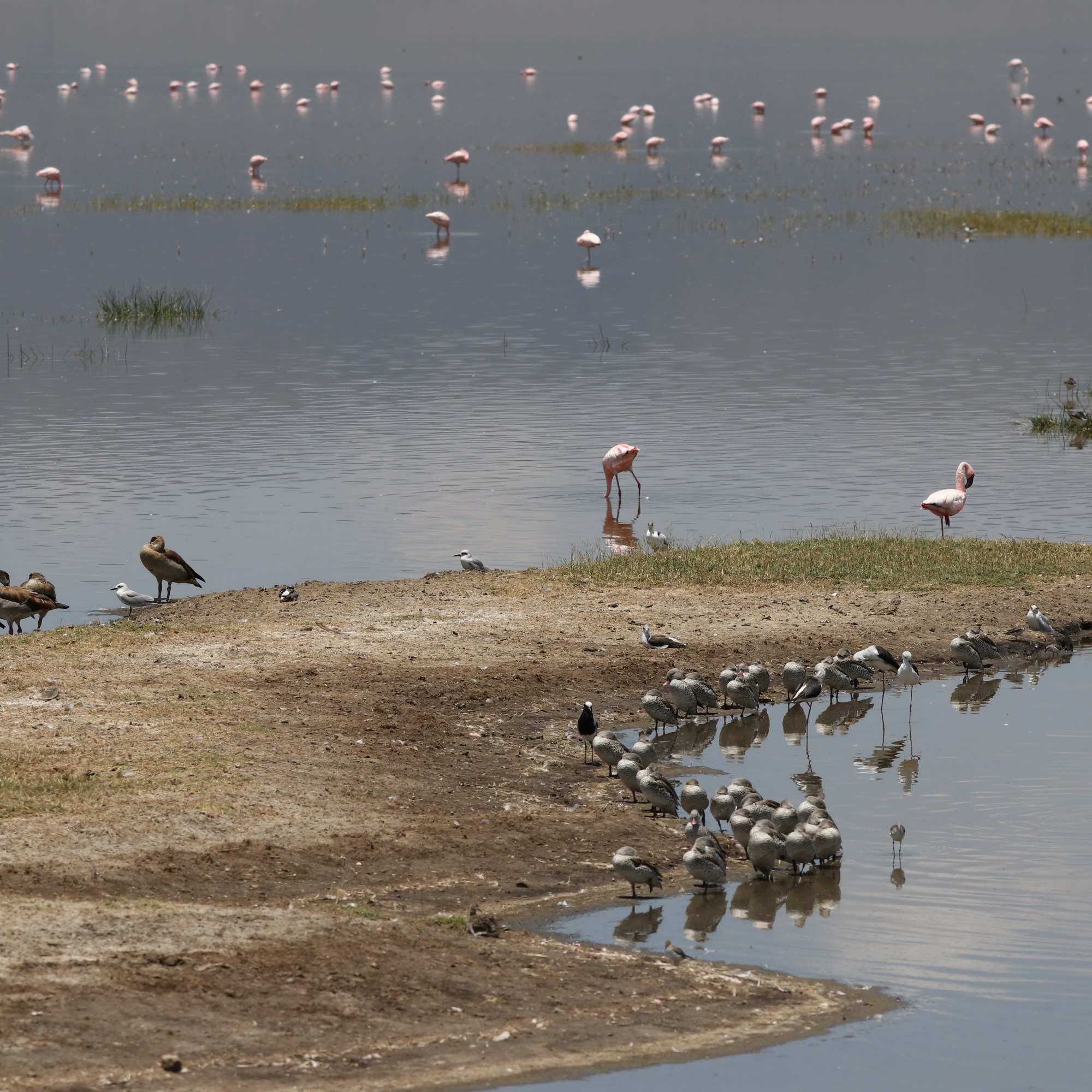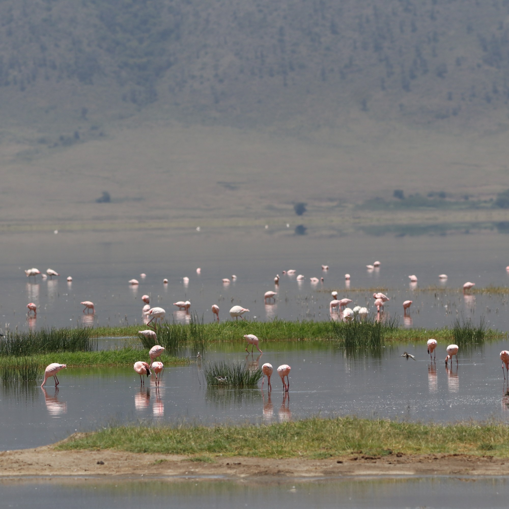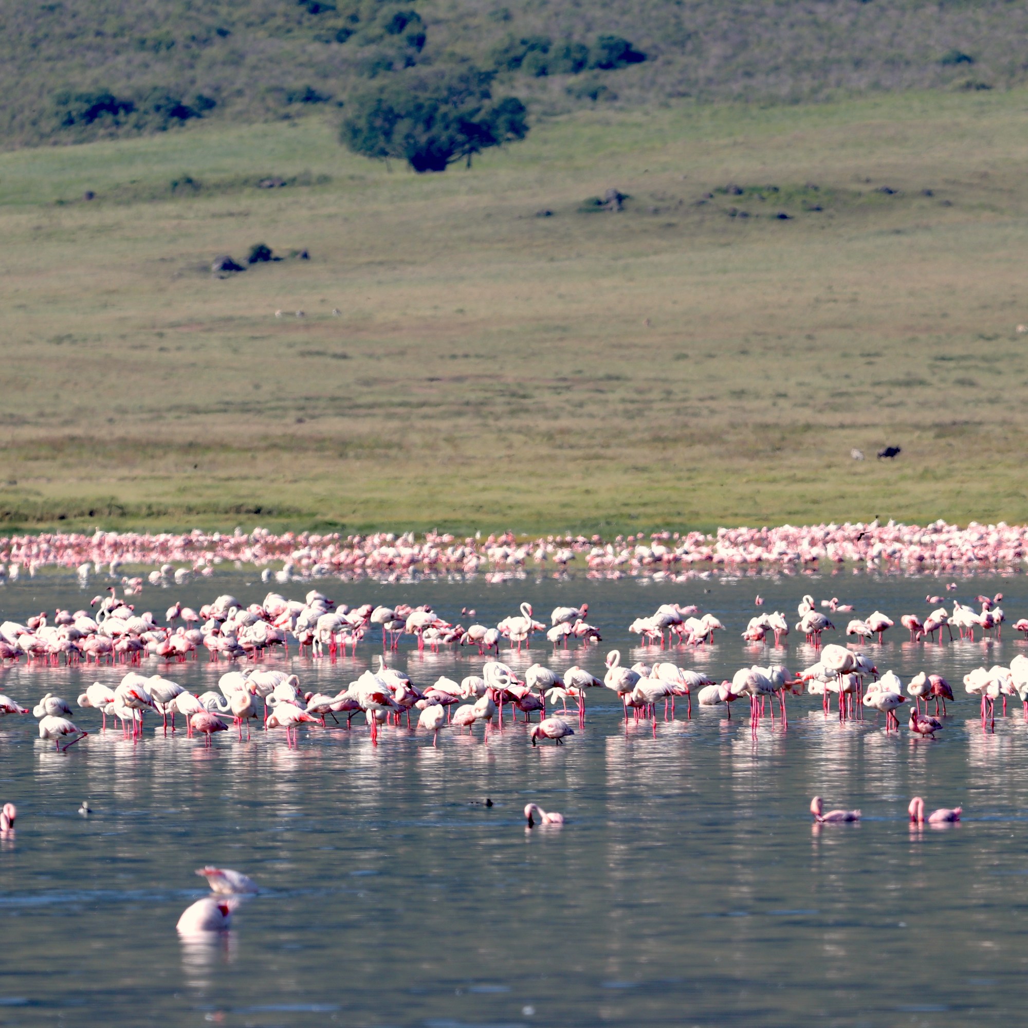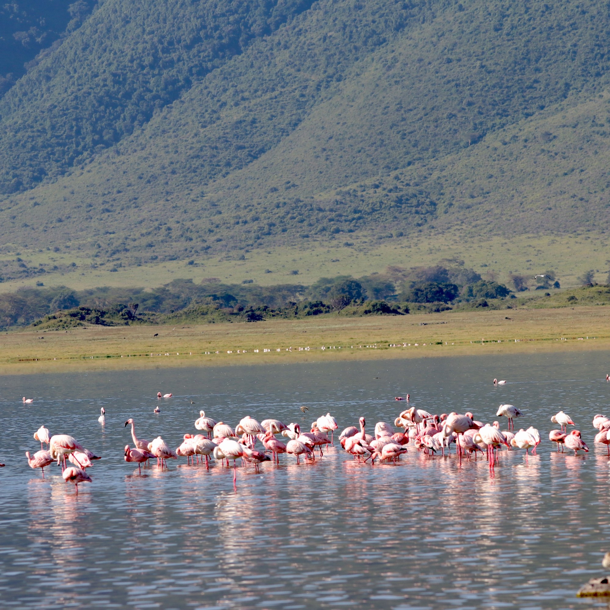 The rays of the rising sun gleam into the Lake Magadi which is a soda lake. The lake is teaming with lesser Flamingos which feed on the blue-green algae that the lake provides and enhances their pink color. Other birds and animals near the shore are grazing in the short grass, all the time being aware of the predators lurking around.