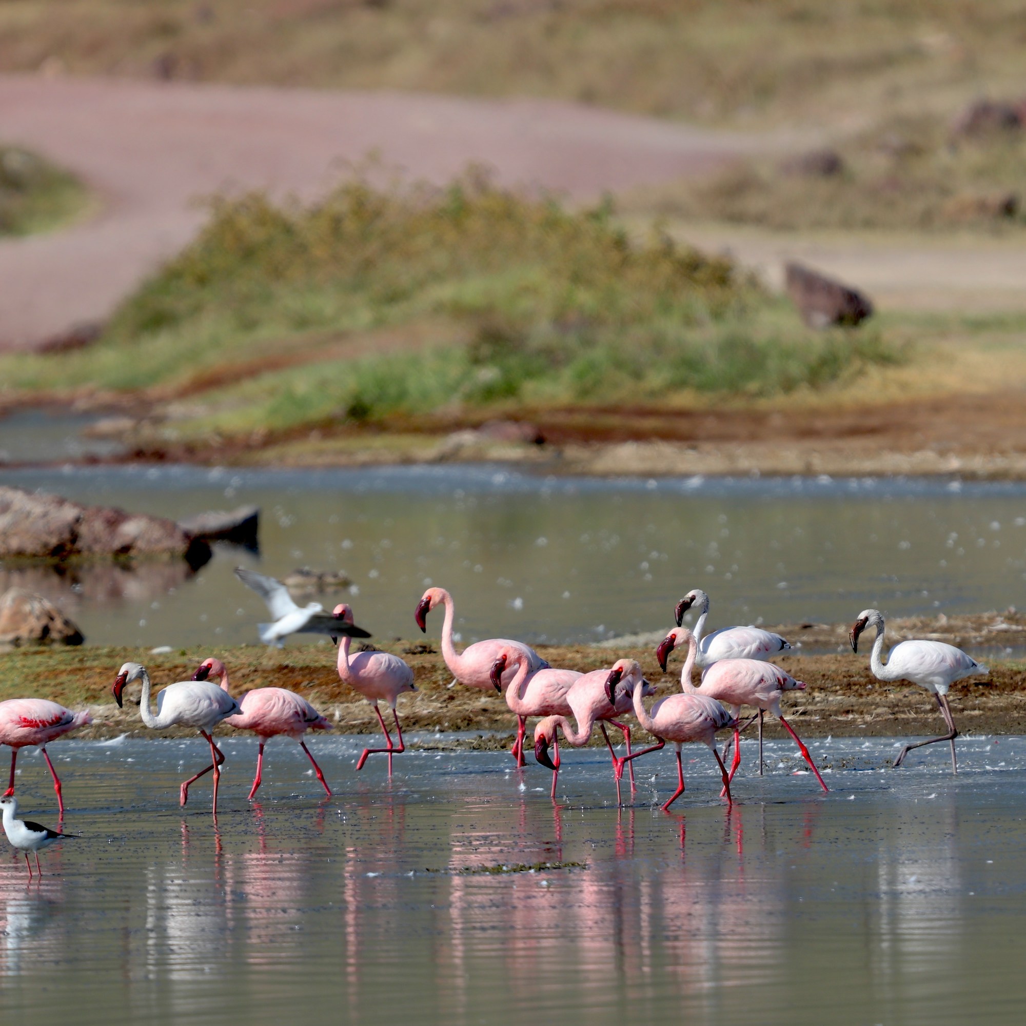We drove towards the lake and were greeted by at least 15000 flamingoes warming up to the morning sun. The lake was shimmering in the morning sun and the pink hues from the flamingos were making the blue-green lake vibrant in colours. If you have ever seen a flamingo fly by you you will know that it looks like a concorde flying by. Long neck and legs and a slender body in between with a vast wingspan make the flamingos flying by look like a concorde airplane. I was here for this scene and wanted to continue feasting my eyes in the serene beauty of the lake and the flamingos, but we had a lot of ground to cover so we moved on..