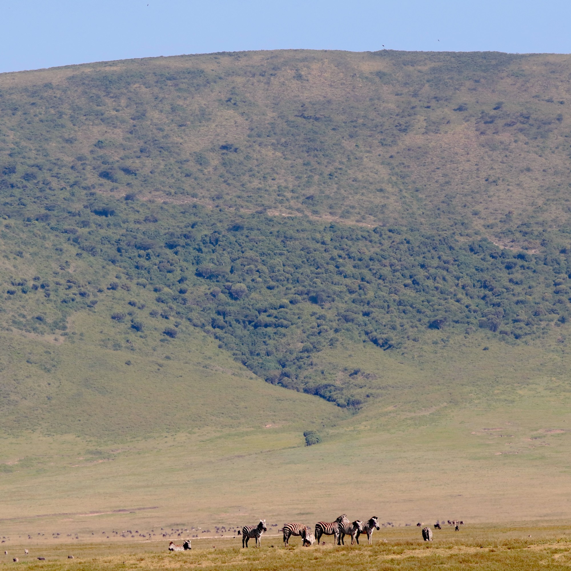 From the crest of the hill, the view was nothing short of mesmerizing—a sweeping, 360-degree panorama of one of nature’s most spectacular theaters. The vastness of the crater stretched before us, teeming with life, every movement a testament to the raw, untamed beauty of the wild. It was a moment of pure wonder, a humbling reminder of how nature exists in perfect balance, untouched by time, thriving in this ancient sanctuary.