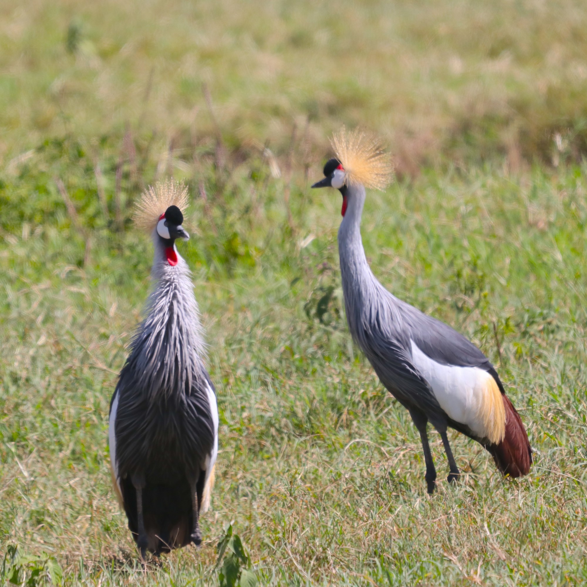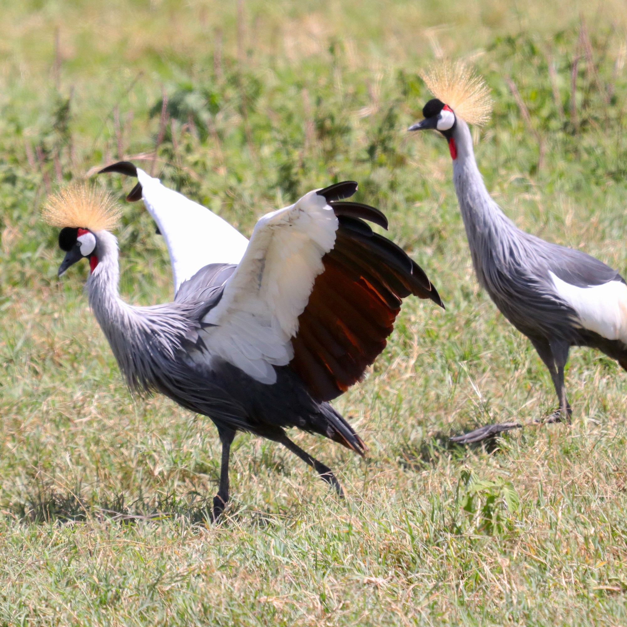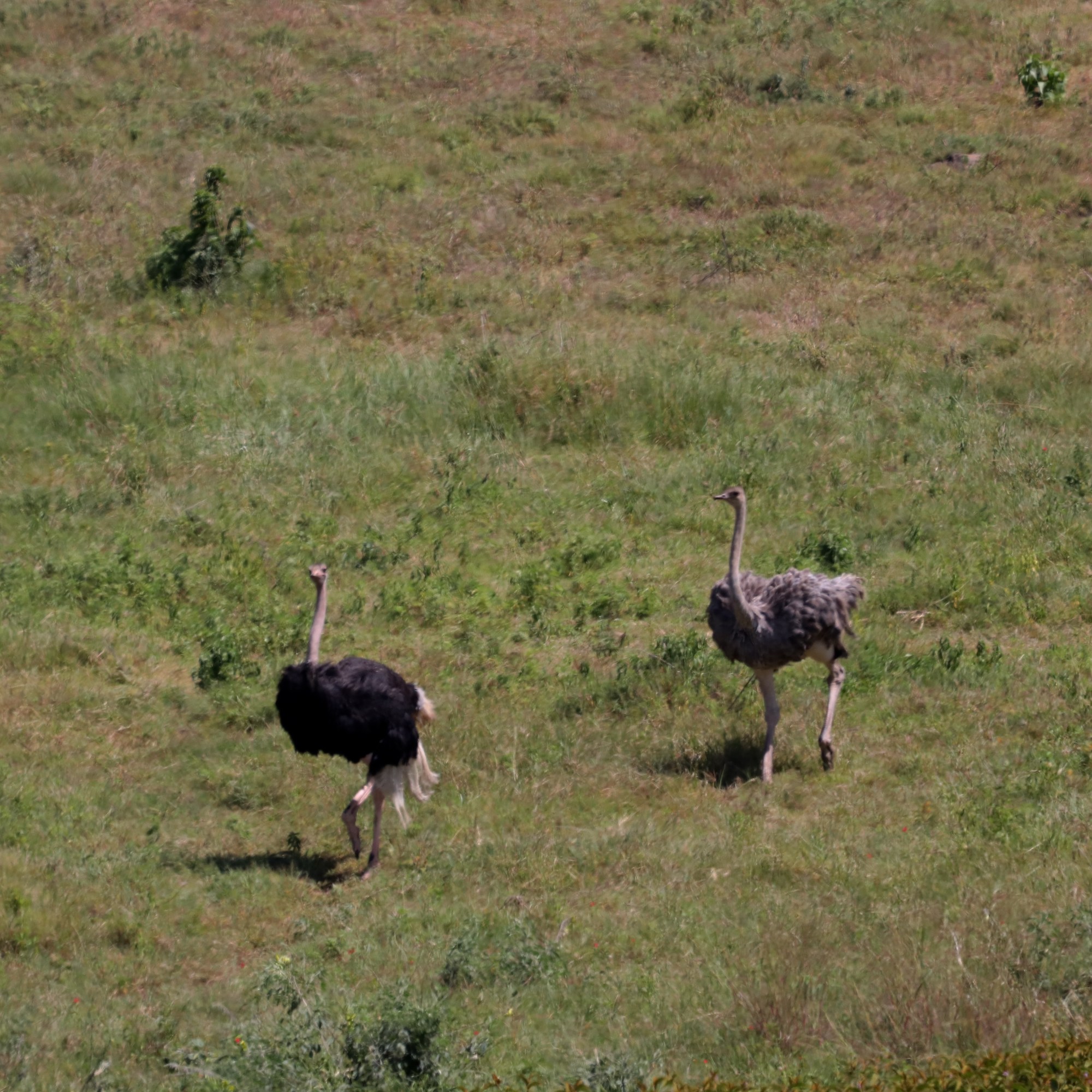 Driving across the hill, we stumbled upon a breathtaking scene—a herd of wildebeest and zebras gathered near a glistening stream. Nearby, a pair of regal Crowned Cranes performed their elegant mating dance, their golden crests catching the sunlight as they moved in perfect harmony. In the distance, two ostriches descended the hill, their long strides carrying them gracefully toward the watering hole, where life pulsed in quiet coexistence.