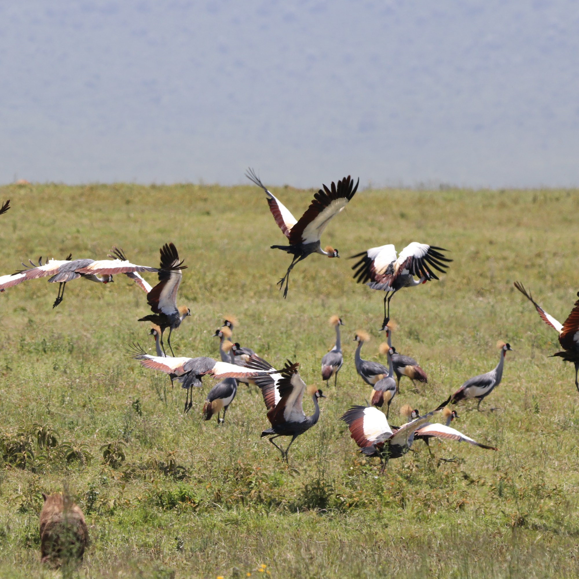 Then, from the other side, a hush seemed to fall over the land as a herd of elephants emerged from the horizon, their sheer presence commanding awe. They moved with slow, deliberate grace, their massive frames silhouetted against the lush green plains. As they approached the stream, the other animals instinctively stepped aside, parting as if paying silent tribute to nature’s gentle giants. It was a moment of unspoken respect, a glimpse into the ancient rhythm of the wild, where every creature knows its place in the grand tapestry of life. Taking some more pictures of the cranes in flight we moved on to explore the other wonders of the caldera.
