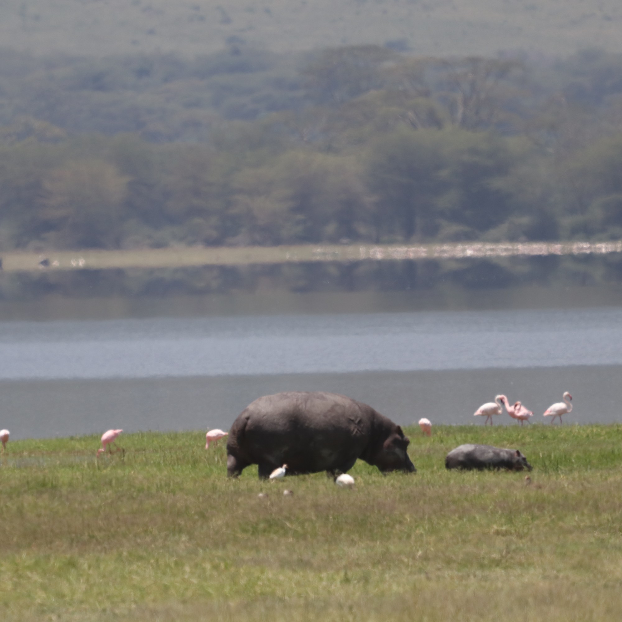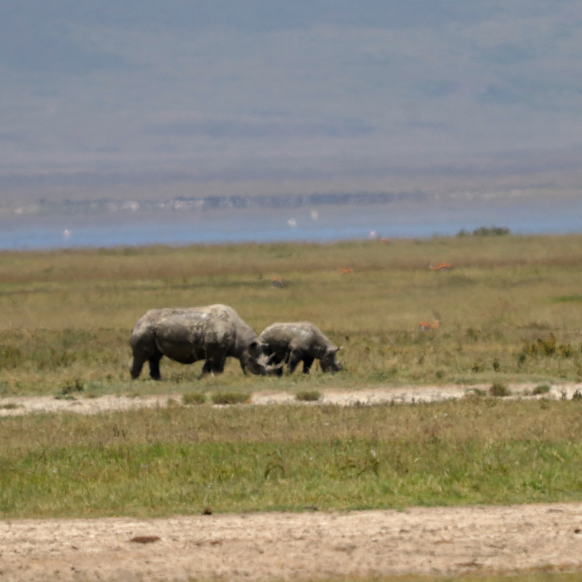 The winding path led us near the other side of Lake Magadi, where a tender scene unfolded before our eyes—a baby hippo grazing gently beside her mother, while a lone wildebeest sipped water against a stunning backdrop of flamingoes and ducks resting languidly along the shoreline. Yet, our hearts were set on a singular, elusive vision. We were on the hunt for the rare black rhino, our eyes constantly scanning the horizon from the top of the jeep.